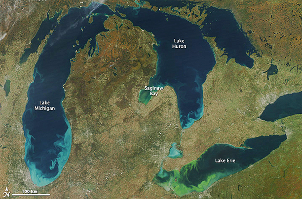 The Moderate Resolution Imaging Spectroradiometer (MODIS) on the Aqua satellite took this image on October 9, 2011, a little more than a week after a persistent mid-latitude cyclone moved out of the region. The storm brought strong winds to the Great Lakes region, and the resulting sediment first became visible on October 1 as the storm clouds started to move away. Some of the pale blue in Lake Erie may be sediment, but the green is an extremely large algal bloom. The algae may have initially spread across the western side of the lake because of windy weather, but calm weather and warm temperatures after the storm allowed green scum to build on the surface, says Colleen Mouw, a researcher at the University of Wisconsin-Madison. The bloom now covers much of the western half of the lake. “This is considered the worst bloom in decades,” says Stumpf. The green in Saginaw Bay is probably an algal bloom as well.