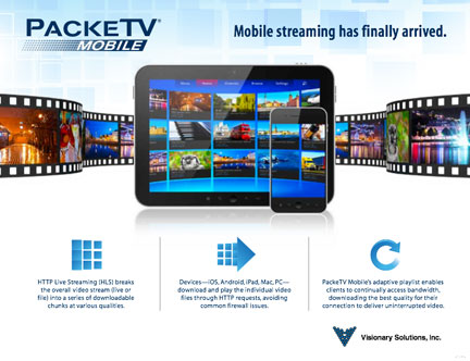 Visionary Solutions Inc. today announced that the company's new PackeTV® Mobile streaming media delivery solution is now shipping. Ideal for a broad range of markets, such as professional A/V, telecommunications, broadcast, corporate, government, education, and houses of worship, PackeTV Mobile simplifies the delivery of live and file-based video content, enabling content administrators to deliver high-quality IP video to any connected device seamlessly, including mobile phones, tablets, and set-top boxes in an enterprise setting.