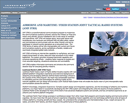 Lockheed Martin [NYSE: LMT] has received additional contract options that increase the quantity of equipment being produced for the Airborne, Maritime/Fixed Station Joint Tactical Radio System (AMF JTRS). AMF JTRS is an encrypted Internet-Protocol network that will provide joint forces with seamless, secure, wideband mobile communications.