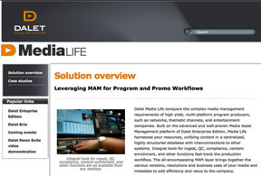Dalet Media Life — Dalet Media Life is an enterprise solution designed to meet the complex production and asset management needs of multi-platform content providers such as networks, thematic channels and promo departments that deal with high volumes of video and audio programming—from movies and TV series to cartoons, promos and jingles. Dalet Media Life focuses on program preparation, bridging the gap that currently exists between rights/planning systems and many automation/delivery systems. Designed on open IT standards, Dalet exploits the flexibility of metadata and Web services API to share content; manage programs delivered in multiple languages; and integrate third-party systems such as QC, subtitling and non-linear editing.