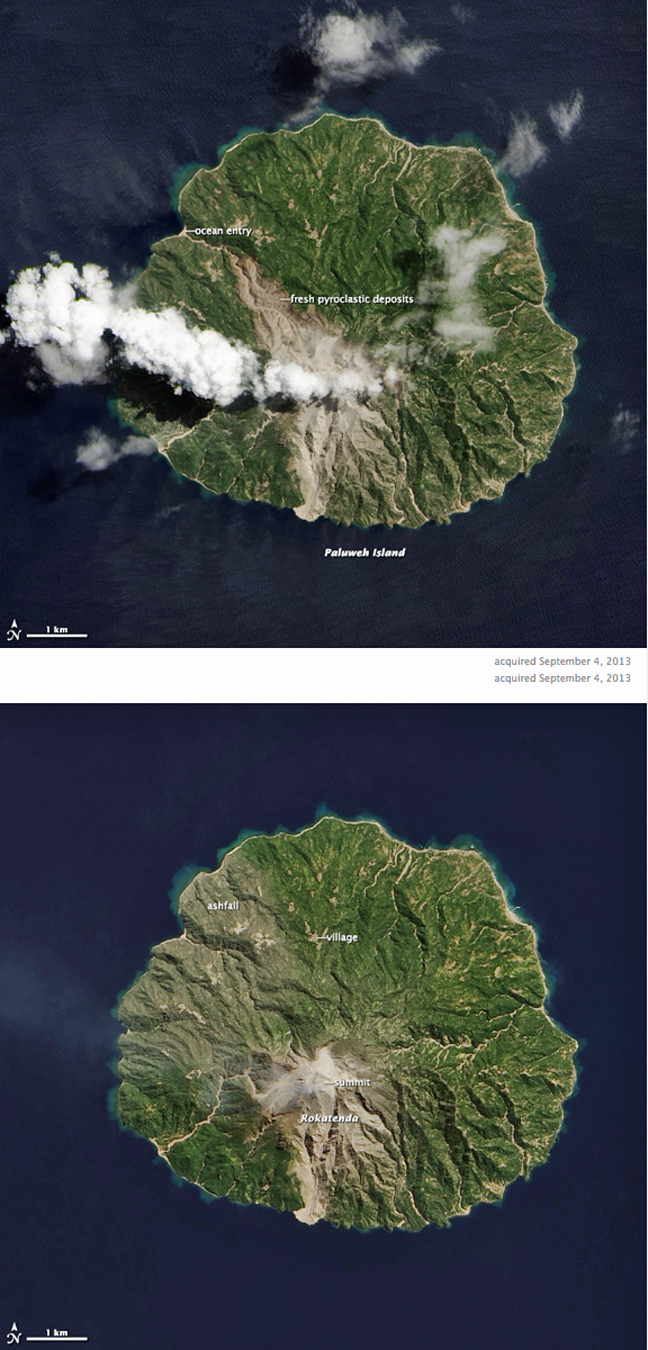These natural-color satellite images collected by Landsat 8 show the effect of the eruption on Paluweh. The top image is from September 4, 2013, and the lower image is from August 3, shortly before the eruption. The summit was hidden by clouds on September 4, but visible on August 3. Also apparent on August 3 was a light coating of ash on vegetation on the northwest side of the island. Irregular gray patches in the deep green forests reveal villages along the shoreline and on the lower slopes of the volcano.