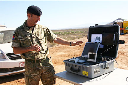 Photo Credit: Amy McLaughlin IMG_6766 British Staff Sgt. Leighton Davies of the 4/7 Regiment, Royal Artillery out of Portsmouth, England, explains the capabilities of the unmanned aerial vehicle Desert Hawk during a demonstration as part of Empire Challenge 2011 at Fort Huachuca.