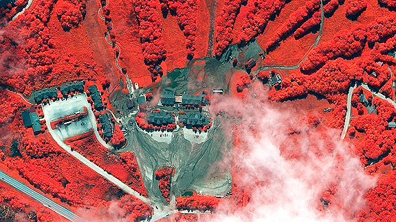 Killington Ski Lodge, Vermont-August 29, 2011: This is a satellite image of damage at the Killington Ski Lodge in Vermont. The bright red vegetation is healthy and the grey areas are where earth has given way in a mud slide around the resort and parking lots. (credit: DigitalGlobe)