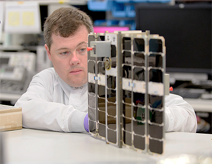 In this photo, Boeing software engineer Darin Anderson prepares one of the SENSE spacecraft for final testing.