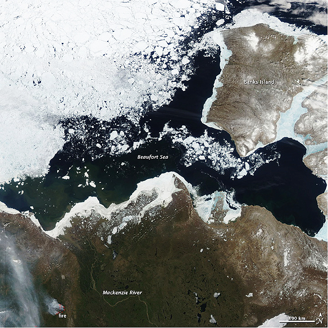 The ever-present Sun transforms the Arctic after a long winter of darkness and cold. This image, from the Moderate Resolution Imaging Spectroradiometer (MODIS) on NASA’s Aqua satellite, shows the western Canadian Arctic on June 10, 2010, a few days after perpetual sunlight commenced for the entire region. The image captures the Arctic in a moment of transformation. Signs of winter are still present, but summer is clearly on the horizon. Sea ice in the Beaufort Sea has started to break up. A swath of open water, black in this image, separates the land from the dense pack of sea ice. Ice still fringes much of the land, but it is thinning. In many places, particularly around Banks Island, the land-bound sea ice is blue, pointing to thin ice or the presence of water on the ice.