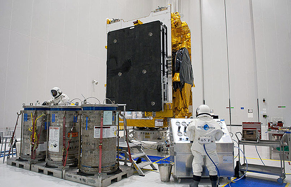 The Arabsat-5C satellite is shown during its propellant fueling, which was performed in the S5B hall of the Spaceport’s S5 payload preparation facility.