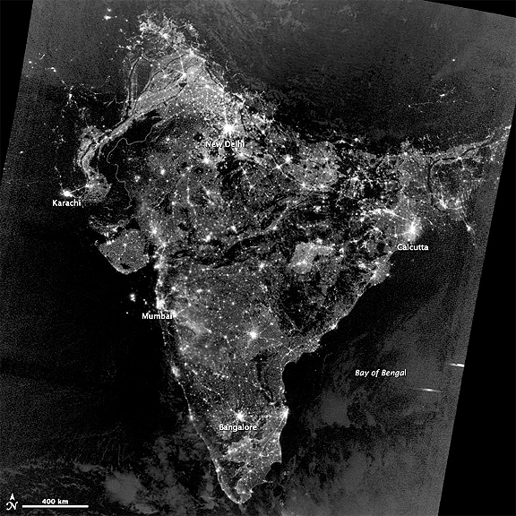 Most of the bright areas are cities and towns in India, the country with the world’s largest Hindu population. India is home to more than 1.2 billion people and has 30 cities with populations over 1 million. (For comparison, China has 62 cities with more than 1 million residents and the United States has 9). Cities in Bangladesh, Nepal, and Pakistan are also visible near the edges of the image.