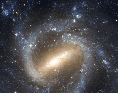 ....in the constellation of Cetus (The Sea Monster). Our own galaxy, the Milky Way, is a similar barred spiral, and the study of galaxies such as NGC 1073 helps astronomers learn more about our celestial home. Most spiral galaxies in the Universe have a bar structure in their center, and Hubble's image of NGC 1073 offers a particularly clear view of one of these. Galaxies' star-filled bars are thought to emerge as gravitational density waves funnel gas toward the galactic centre, supplying the material to create new stars. The transport of gas can also feed the supermassive black holes that lurk in the centers of almost every galaxy.