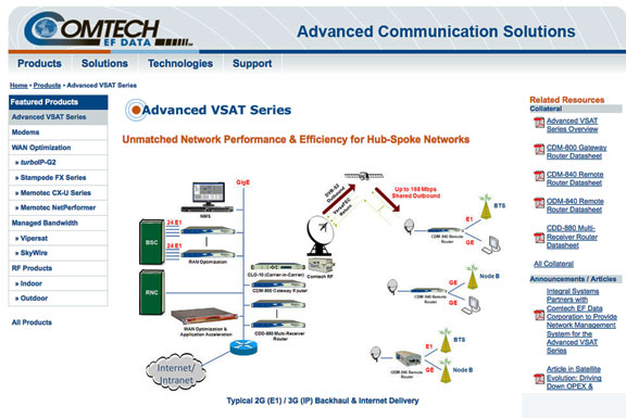 The recently released Advanced VSAT are industry-leading solutions for mobile backhaul, Universal Service Obligation networks, corporate networks, Internet access and other applications requiring high-performance IP transport in hub-spoke network environments. Incorporating advanced technologies developed by Comtech EF Data, Comtech AHA and Memotec, these products are specifically designed to provide unmatched performance at an attractive price for a wide range of applications.
