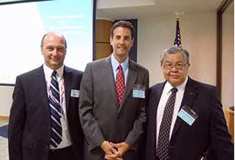 YOU ARE THE CUSTOMER—Nearly a hundred small businesses owned by veterans and service-disabled veterans received practical tips and advice on winning new business from federal, state and military procurement offices at the Federal Procurement Information and Training Event hosted by ARINC Incorporated on Monday September 20 at its Annapolis headquarters. Congressman John Sarbanes (center) Edward Chow, Jr. (right), Secretary of the Maryland Department of Veterans Affairs, and ARINC Director Walt Tomczykowski (left).