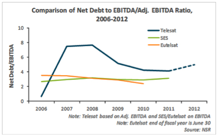 While many of Telesat’s competitors were quick to shake their heads at this about face, Telesat’s management noted that the special dividend payment would only add about $530 million in new debt to the company according to press reports. In support of Telesat’s position, an analysis of Telesat’s Net Debt to Adj. EBITDA ratio based on data from NSR’s recently published “Satellite Operator Financial Analysis” study, as well as recently released annual reports for 2011, largely supported this contention.