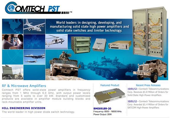 ...$1.4 million of orders for high-power amplifiers from a leading provider of aviation electronics and communication systems. The amplifiers are used as part of satellite communications systems which provide commercial mobile airborne-to-satellite-to-ground communications service. The systems provide operators with the ability to access Inmarsat's Aero-H, Aero-I and SwiftBroadband service for aeronautical satellite communications with multi-channel voice, fax and data capabilities. These orders supplement a significant installed base of Comtech high-power amplifiers previously delivered to this customer.