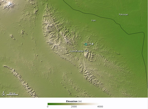 This image, based on elevation data acquired by the Advanced Spaceborne Thermal Emission and Reflection Radiometer (ASTER) on NASA’s Terra satellite, shows the area where the earthquake occurred. Land is shown with shades of green and beige. Higher elevations are lighter in color.