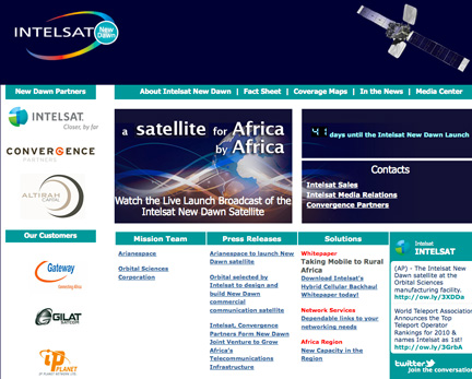 A joint venture between a consortium led by Convergence Partners and Intelsat S.A., the New Dawn satellite and its 28 C- and 24 Ku-band 36 MHz transponder units are designed specifically to supply critical communications infrastructure for African customers. Operating from a geostationary orbital slot at 32.8 degrees East, Intelsat New Dawn will be ideally positioned to serve Africa through a payload optimized to deliver wireless backhaul, broadband and media content - the fastest growing satellite-based applications in Africa. Delivered on time and within the originally announced $250 million budget, the Intelsat New Dawn venture has been approximately 90 percent funded from African sources. The Convergence Partners consortium also includes strategic shareholder Altirah Telecoms and the not-for-profit Convergence Partners Foundation.