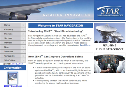 Most people are familiar with the "black box", the near indestructible sealed recording device that assists investigators in determining the cause(s) of an aircraft accident. What isn't as well known is that not only are black boxes not the complete solution, but by their very nature, they are designed to indicate problems after they have already occurred, much too late to help the pilots and passengers. A real-time counterpart to traditional black boxes is needed and Star Navigation has answered the call. Star Navigation's In Flight Monitoring Service, first introduced in 2005, was a quantum leap ahead in aerospace safety and monitoring technology. It performed all of the functions of black boxes while providing current information to pilots and ground controllers, giving the ability to note any anomalies and to nip problems in the bud. The improved STAR-ISMS In Flight Safety Monitoring System provides both real-time and after-landing reports, intelligent flight data transmission, plus more detailed live flight data alerts through the efficient use of leading edge satellite-based technology.