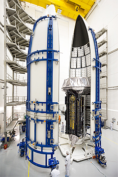 On January 29, Lockheed Martin encapsulated the first MUOS satellite into its launch vehicle payload fairing in preparation for its February 16 launch aboard an Atlas V rocket. Photo courtesy of Lockheed Martin.