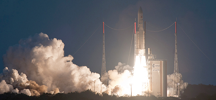 ...areas that include Europe, Africa, the Middle East, Central Asia and South America were orbited today by Arianespace on the company’s sixth Ariane 5 flight of 2012. Lifting off on time at 6:05 p.m. from the Spaceport’s ELA-3 launch complex in French Guiana, the heavy-lift workhorse deployed its EUTELSAT 21B and Star One C3 spacecraft passengers during a 33-minute mission. It was the 66th flight of an Ariane 5 and the 210th launch of a European-built Ariane family vehicle, maintaining Arianespace’s sustained mission pace in 2012.
