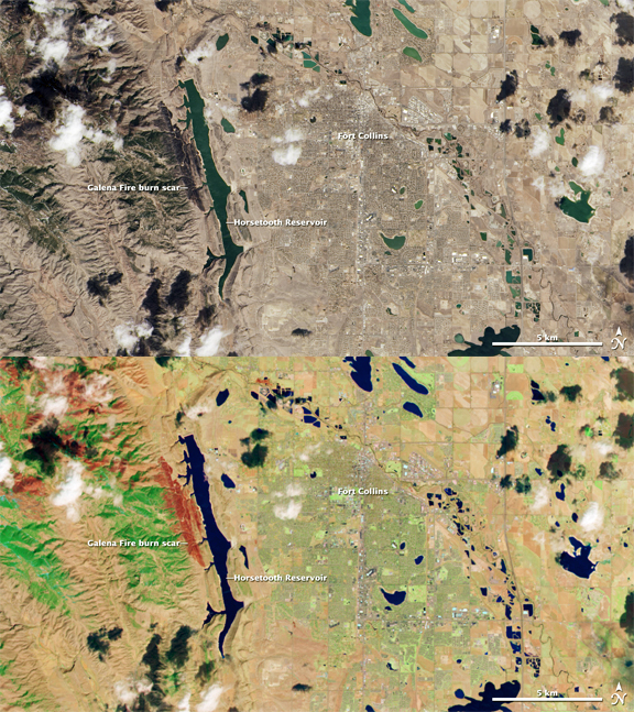 These images are of the area around Fort Collins, Colorado. On the top, the image is shown in natural color, created using data from OLI spectral bands 2 (blue), 3 (green), and 4 (red). The image on the bottom was created using data from OLI bands 3 (green), 5 (near infrared), and 7 (short wave infrared 2) displayed as blue, green and red, respectively. In the left-hand natural color image, the city's elongated Horsetooth Reservoir, a source of drinking water, lies west of the city. A dark wildfire burn scar from the Galena Fire is visible just to the left of the reservoir. The scar shows up bright, rusty red in the false color image.
