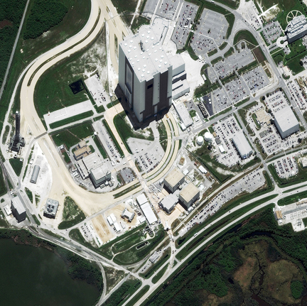 Space Shuttle Atlantis at Vehicle Assembly Building, Launch Complex 39, Kennedy Space Center, Merritt Island, Florida-July 21, 2011: This is a satellite image of the Space Shuttle Atlantis taken at 12:52pm local time. The Shuttle is visible on the lower center part of the image coming off the main roadway as it was being towed back to the Vehicle Assembly Building. Crowds of people can be seen standing near the Shuttle as well. This was the last Shuttle mission for NASA. (credit: DigitalGlobe)