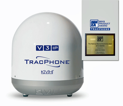 TracPhone V3, which won the "Communications Product Award," is an extremely compact Ku-band VSAT antenna that provides broadband connectivity to boats as small as 30 feet. Designed for today's era of increasing reliance on the Internet and social media, TracPhone V3 enables boat owners to stay connected no matter where they may be cruising. The system utilizes KVH's worldwide mini-VSAT Broadband(SM) network, which is the only maritime network using spread spectrum technology (similar to that used in the high-powered 3G and 4G networks on land). This advanced technology makes it possible to offer broadband speeds at up to 2 Mbps from the TracPhone V3 onboard system, which has an antenna that is only 14.5 inches in diameter. KVH built the mini-VSAT Broadband network to provide high-quality, affordable marine satellite phone and Internet service, and offers airtime rates as low as $0.49 per MB, and phone calls for only $0.49 per minute worldwide.