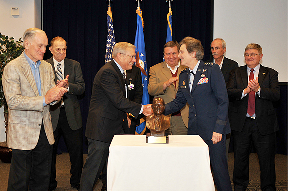 U.S Air Force Lt Gen Ellen Pawlikowski, Commander of the Space and Missile Systems Center (SMC), shakes hands with Dr. Bradford W. Parkinson, Chief Architect for the Global Positioning System (GPS) as she accepts the Dr. Robert H. Goddard Memorial Trophy on behalf of the Global Positioning Systems Directorate.