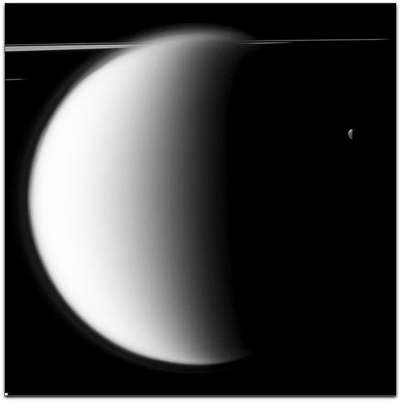 This view looks toward the sunlit side of the rings from just above the ringplane. Part of the rings are in the shadow of Saturn. The view was obtained at a distance of approximately 1.1 million kilometers (684,000 miles) from Titan and 2.5 million kilometers (1.6 million miles) from Mimas. The image was taken in visible light with the Cassini spacecraft narrow-angle camera on Nov. 27, 2009. Scale on Titan is 7 kilometers (4 miles) per pixel. Scale on Mimas is 15 kilometers (9 miles) per pixel. The Cassini-Huygens mission is a cooperative project of NASA, the European Space Agency and the Italian Space Agency. The Jet Propulsion Laboratory, a division of the California Institute of Technology in Pasadena, manages the mission for NASA's Science Mission Directorate, Washington, D.C. The Cassini orbiter and its two onboard cameras were designed, developed and assembled at JPL. The imaging operations center is based at the Space Science Institute in Boulder, Colorado.