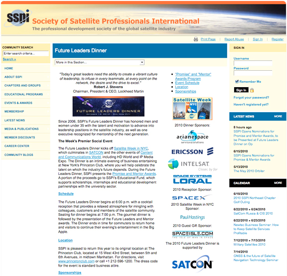 Mentor Award nominees are distinguished by their voluntary contributions to industry causes and track record of coaching, motivating and fostering young professionals to elevate their professional capabilities and leadership potential. Past Mentor Award winners have included Dick Tauber of CNN, Dom Stasi of Avail/TVN, Francesco Frenza of the Cisneros Group, and Andrew Werth of Hughes Network Systems. A portion of the proceeds from the dinner go to SSPI's Educational Fund. This year, as part of its sponsorship of the awards event, SpaceIsle.com will donate an additional $3,000 directly to the Fund in lieu of a guest appreciation gift. SpaceIsle is also SSPI’s Mission Underwriter for 2010. The Educational Fund helps deserving university students meet the high costs of undergraduate and post-graduate study in satellite-related disciplines. The Fund also supports internship opportunities with satellite industry employers; the development of educational content for satellite professionals; and Web-based content that helps students connect with university-level satellite programs and explore career opportunities in the industry.