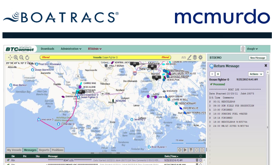 Boatracs BTConnect® AIS (Automatic Identification System) extends the functionality of BTConnect, the most widely used vessel tracking and fleet management software in the U.S. commercial maritime market, by integrating real-time messaging and vessel tracking with AIS data on a single display. The AIS Man Overboard (MOB) Alarm Notification System, a joint solution development effort between Boatracs and Orolia sister company McMurdo, is an innovative safety solution that enables distress signals from McMurdo’s Smartfind MOB AIS beacons to be displayed on BTConnect software for accelerated emergency response.