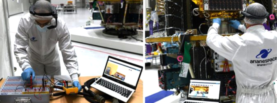 Arianespace personnel are using smart glasses during certain payload checkout activities for Flight VV16 at the Spaceport in French Guiana, enabling customers to remotely monitor operations performed on satellites that will be orbited this month by the Vega light-lift launcher.