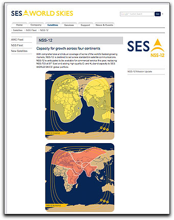 NSS-12 was successfully launched onboard an Ariane 5 rocket on October 29, 2009. The spacecraft replaces NSS-703 at a key orbital location at the crossroads of Europe, the Middle East, Africa, Asia and Australia. All traffic on NSS-703 has been transferred to NSS-12. NSS-12 delivers DTH power and performance through four regional Ku-band spot beams over the Middle East, Europe, Central and Southern Asia and, for the first time, Eastern Africa. The satellite’s high-capacity, high-power C-band hemispheric beams — one covering Europe, Africa (including Mauritius) and the Middle East, and the other stretching across Asia to Australia — have been augmented by a powerful C-band global beam spanning from the UK to the Far East. The satellite reaches an estimated two-thirds of the world’s population. It features 40 C-band transponders and 48 Ku-band transponders with DTH power levels, as well as elaborate beam interconnectivity and C/Ku-band cross-strapping. The NSS-12 spacecraft was manufactured by Space Systems/Loral (SSL), a subsidiary of Loral Space & Communications.