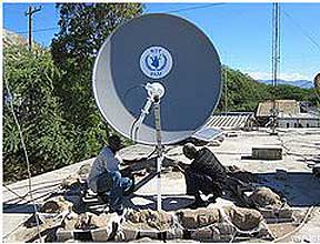 Members of the World Food Programme’s emergency response telecommunications team use satellite.