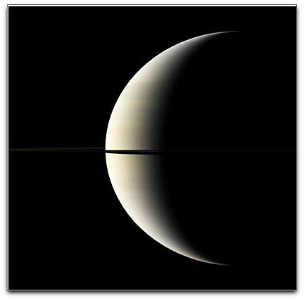 A pastel crescent of Saturn is interrupted by the moon Mimas and the rings in this color image. Mimas (396 kilometers, or 246 miles across) appears as a dark speck just above the rings.