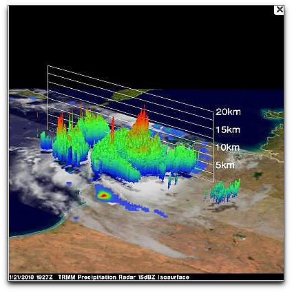 The TRMM rainfall analysis is derived from TRMM’s Precipitation Radar (PR) and TRMM Microwave Imager instruments (TMI). It revealed that Magda had developed an eye before coming ashore with hurricane force winds. TRMM also showed that there were powerful thunderstorms were dropping rainfall at a rate greater than 50mm per hour (~2 inches per hour) in an area west of the eye. TRMM’s 3D perspective of Magda showed that some of the intense thunderstorms near its eye reached to heights above 16 kilometers (~52,493 feet). Magda has since moved inland and is forecast to dissipate in Western Australia’s Great Sandy Desert. TRMM is managed by NASA and JAXA, the Japanese Space Agency. (Image provided by NASA’s Goddard Space Flight Center)
