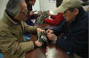 Title: Northern Pintail Duck Description: Dr. Hiroyoshi Higuchi (left), Mr. Ken-ichi Tokita (right), and other cooperators from the University of Tokyo, work with USGS scientists to attach a satellite transmitter to the backs of northern pintail ducks on wintering areas of Northern Honshu, Japan. Transmitters are used to evaluate their movements, migration, and areas of overlap with North American northern pintails. Location: USA Photographer: , U.S. Geological Survey