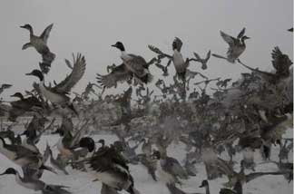 Title: Northern Pintail Ducks Description: A flock of wintering northern pintail ducks takes flight in Northern Honshu, Japan. Location: USA Photographer: , U.S. Geological Survey