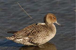 Title: Northern Pintail Duck Description: A northern pintail duck wearing a transmitter. Location: USA Photographer: , U.S. Geological Survey