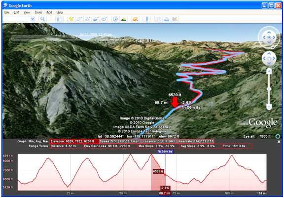With the release of Google Earth 5.0, the company added the ability to connect your GPS device directly to Google Earth and import your track. Now, with Google Earth 5.2, added is the ability to view elevation, speed, and other data as a graph directly in Google Earth. Just connect your GPS device to upload your track, and select “View Elevation Profile” from the menu. This will bring up elevation and speed graphs. If your GPS device records additional information such as heart rate or cadence, these will also be available to view in the graph. You can also see statistics such as total elevation, maximum slope, and average speed. You can select a portion of your ride and get statistics for just that section.