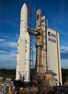 This is the third Ariane 5 mission in 2010, and it will orbit a pair of Thales Alenia Space-produced satellites: NILESAT 201 and RASCOM-QAF1R. Liftoff is scheduled during a launch window that opens at 5:45 p.m. and continues to 8:34 p.m., local time in French Guiana.