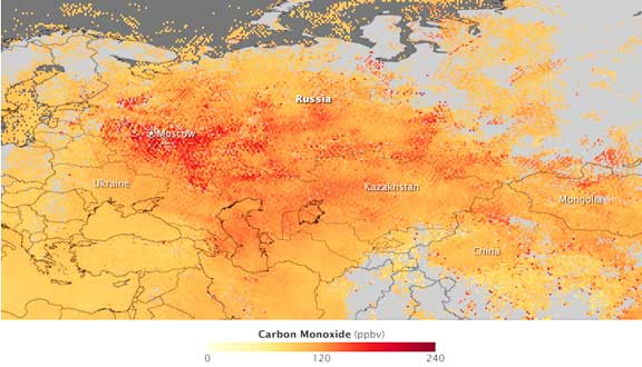 MOPITT measures carbon monoxide in the atmosphere between two and eight kilometers above Earth’s surface. The image shows the composite of those measurements, not carbon monoxide levels near the ground. However, ground measurements of carbon monoxide during the period reached more than six times higher than acceptable levels in Moscow, said news reports. Carbon monoxide is a dangerous product of fire. The gas can remain in the atmosphere for weeks after being emitted and can therefore travel long distances from the fire that produced it. When it is near the ground where people can breathe it, carbon monoxide poses a health risk. Carbon monoxide binds to red blood cells more easily than oxygen, so it limits the amount of oxygen blood carries through the body. This causes a range of problems from headaches, nausea, and dizziness to cardiovascular problems and confusion. Carbon monoxide is also an ingredient in the production of ground-level ozone, which causes a number of respiratory problems.