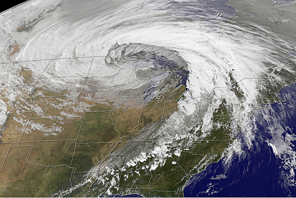 This image, taken by the GOES satellite on October 26, shows the storm system circling around the area of extreme low pressure. Such extratropical cyclones form over the United States in the spring and fall, when the temperature difference from north to south is large. Warm, high-pressure air rushes toward the cooler, low-pressure air in the north. Because the Earth is rotating, the air moving in ends up circling the area of low pressure, creating the cyclone shown in the image. The intensity of the storm is determined by the pressure difference between the center and the outer edges. Extreme low pressure in the center of the storm, therefore, is an indicator that the storm was very intense. The cyclone formed very quickly on October 26, taking a distinctive comma shape as the day went on. The storm developed so quickly, in fact, that it is classified as a bomb, an extremely fast developing storm (dropping at least one millibar of pressure per hour for 24 hours), more common over water than land.