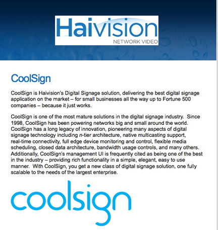 HaiVision CoolSign infopage link… CoolSign, a veteran player in the digital signage market (established 1998), provides comprehensive software solutions for mission critical enterprise-ready signage deployments. With CoolSign, Haivision can deliver solutions that combine intelligent video with graphics and data easily and securely to any desktop, display, digital frame, and mobile device. CoolSign was initially launched more than 12 years ago and boasts a very large installed base of networks and players at premier clients, covering a broad spectrum from retail to corporate, to pure-play digital-out-of-home advertising (DOOH) networks. CoolSign is a feature-rich signage solution, incorporating sophisticated technology to control, schedule, distribute, display, and monitor digital media. Haivision is maintaining the excellent CoolSign brand under the Haivision umbrella and is planning strong cross product technical development to introduce Makito™ performance HD video encoding into the CoolSign solution suite and to extend the Furnace™ IP video system with the signage control capabilities of CoolSign.
