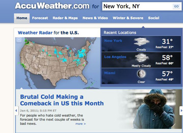 The AccuWeather.com application can be viewed as part of Panasonic’s VIERA Connect demo at the 2011 International CES event held January 6-9, 2011 in Las Vegas. The event will be held at the Las Vegas Convention Center and the Panasonic exhibit can be found within Central Hall in adjacent booths 9408 and 9808.