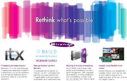 [SatBroadcasting(tm)] Miranda Technologies Inc., the worldwide provider of infrastructure, playout and monitoring systems for broadcasters and cable/satellite/IPTV operators, has completed the first phase of its integration with recently acquired OmniBus Systems, the IT-based automated playout specialist.