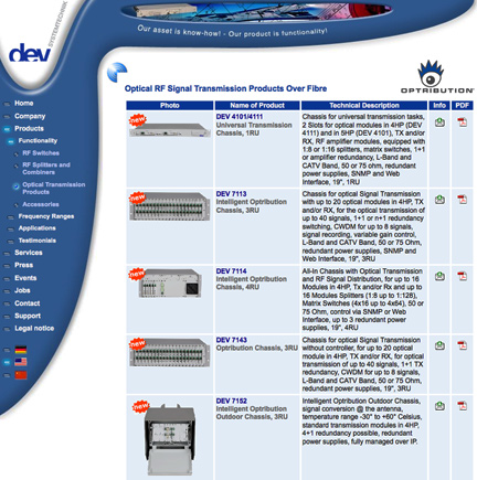 Optribution – Optical Transmission and Distribution of RF Signals – is the cornerstone of DEV Systemtechnik’s participation in the ANGA Cable 2011 conference and trade fair in Cologne, Germany, May 3 to 5, 2011. At Stand G28 in Hall 10.2, DEV will present an extensive spectrum of products for the optical transmission, reception and distribution of RF signals. It covers the entire signal path between antenna and receiver with a multitude of combination possibilities. According to the Company’s motto of “less is more,” the user obtains more functionality in less devices and at lower cost. Three different Optribution rack chassis and one Outdoor Chassis may be configured with a choice of four transmitter cards with as many as 12 options, four receiver cards with up to three options, optical CWDM multiplexers and demultiplexers and numerous redundancy options to build a large variety of devices. The number of signals to be transported decides the selection of the best fitting Optribution product. The 1RU chassis with two universal slots accepts up to two signals. The 3RU chassis with up to 20 optical slots can handle up to 40 signals plus LNB supply. For the first time ever, DEV shows redundancy options for its 4RU chassis with 16 optical slots which is able to send, receive, distribute (1:8, 16, 32, 64, 128) and switch (4×8, 16, 32 and 4×64) optical RF signals. This allows for a further reduction of device count in many systems.