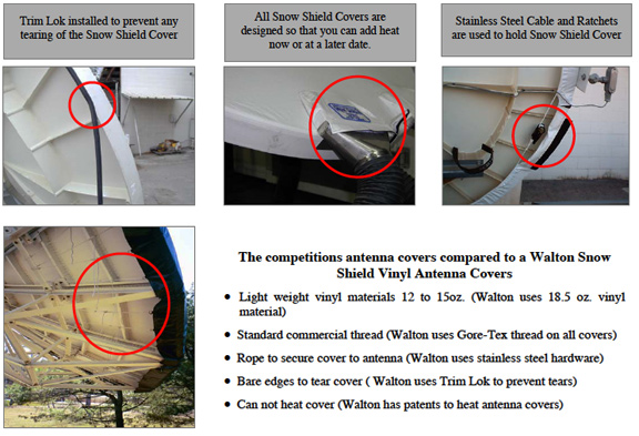 During Satellite 2011, at the W.B. Walton booth, it was quite obvious the interest in the Company’s Gore-Tex Snow Shield remains high. The Snow shield is designed to prevent snow and ice from accumulating on satellite Earth Station Antennas, ranging in size from 0.6 meters to 6.3 meters in diameter, but does not apply to all antennas over 5 meters in size and larger. The passive snow shield system (US patent 5,729,238, additional patents pending) consists of a PTFE coated GORE-TEX® Fabric cover stretched over the reflector. This PTFE coating has the lowest coefficient of friction of any solid material, which makes it difficult for the snow and ice to adhere to the surface.Due to this PTFE coating, under most conditions, snow simply slides off the cover.