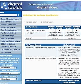 - Digital Rapids is offering attendees of the 2011 NAB Show a preview of a new extension to the MediaMesh business-to-business content delivery system. The new MediaMesh TX content contribution appliance provides flexible, easy-to-use content packaging and sending capabilities mirroring the robust features of the proven MediaMesh RX receiving appliance. Scaling from point-to-point delivery to sophisticated global distribution networks, the MediaMesh content delivery system combines robust, scalable transfer technology with full-featured, easy-to-use sending and receiving solutions, providing efficient transfer of digital media files between content providers, contributors, aggregators and distribution partners. Optimizing the transfer of HD, SD and Digital Cinema media over terrestrial IP networks and satellite, MediaMesh delivers content ranging from ad spots to syndicated series and long-form features with significant cost savings and a combination of speed, simplicity, security and flexibility. MediaMesh TX contribution appliances blend powerful, centralized inventory management with best-in-class media transformation and packaging capabilities, enabling flexible submission, repurposing and delivery of file-based media. Features include content and metadata management; file conforming and transcoding; resource creation (such as proxies and thumbnails); quality control verification; playout; print-to-tape; and delivery to individual recipients or groups at the network ‘edge’.