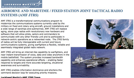 Lockheed Martin [NYSE: LMT] has announced that the National Security Agency (NSA) has conditionally recognized completion of critical design for the Airborne and Maritime/Fixed Station Joint Tactical Radio System (AMF JTRS). AMF JTRS is an encrypted, Internet Protocol, software-reprogrammable, multi-band/multi-mode capable, mobile ad-hoc network that will enable U.S. Army, Air Force and Navy warfighters to share real-time voice, video and data communications. AMF JTRS will be the first JTRS program that will link air, ground and sea echelons and includes a two–channel Small Airborne Joint Tactical Radio, a four–channel (scalable to eight channels) Maritime/Fixed Joint Tactical Radio, and common ancillaries that will support platform integration. These full duplex, software-defined radios will be integrated into airborne, shipboard, and fixed-station platforms, enabling maritime and airborne forces to communicate seamlessly and with greater efficiency.