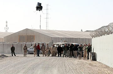 The RQ-16A T-Hawk unmanned aerial vehicle hovers over a group of coalition forces and civilians, during a technical display performed by Honeywell at Kandahar Airfield. Technicians from Honeywell International invited coalition forces to witness how the miniature air vehicle can be be used on routine operations. (U.S. Army Photo by Spc. Jonathan W. Thomas)