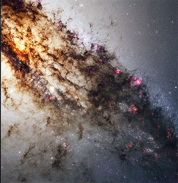 The dark dust lane that crosses Centaurus A does not show an absence of stars, but rather a relative lack of starlight, as the opaque clouds block the visible light from reaching us. Hubble’s Wide Field Camera 3 has focussed on these dusty regions, which span from corner to corner in this image. Wider views from ground-based telescopes show this stripe crossing the entire galaxy. Interesting features such as the warped shape of its disc of gas and dust (outside the view) hint that at some point in the past, Centaurus A collided and merged with another galaxy. The shockwaves of this event caused hydrogen gas to coalesce and sparked intense areas of star formation, as seen in its outlying regions and in red patches visible in this Hubble close-up.