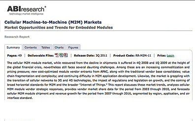ABI Research’s report, Cellular Machine-to-Machine (M2M) Markets, examines the market for cellular M2M embedded modules by assessing key market trends, the competitive landscape, market shares, and important standards and technologies and by providing an extensive five-year forecast of shipments and revenue for the period from 2010 to 2016 segmented by region, application, and cellular air interface standard. The report is part of ABI Research’s M2M research service.